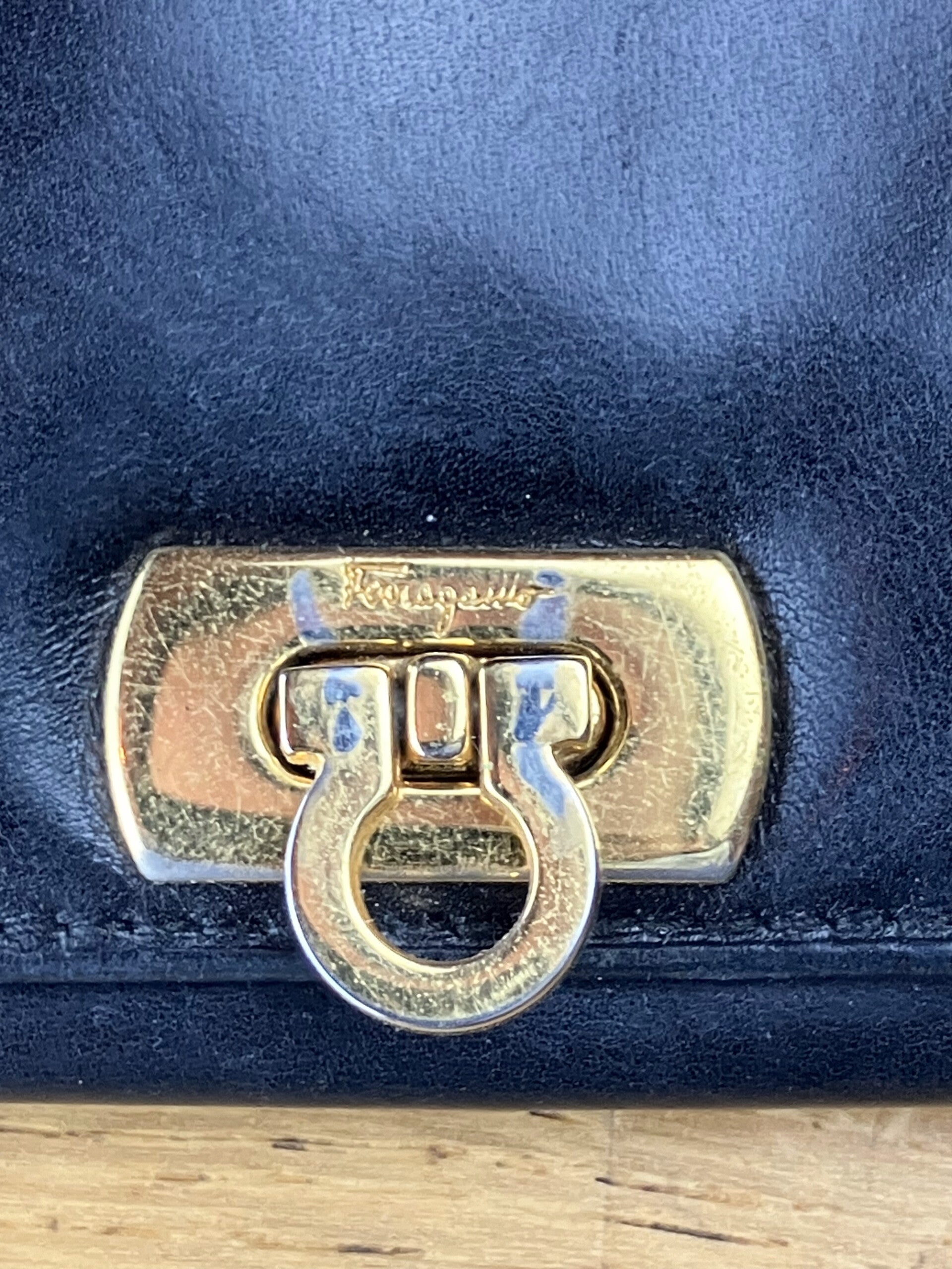 Classic Salvatore Ferragamo wallet, black leather. minor flaws but damaged hardware. 1980's.